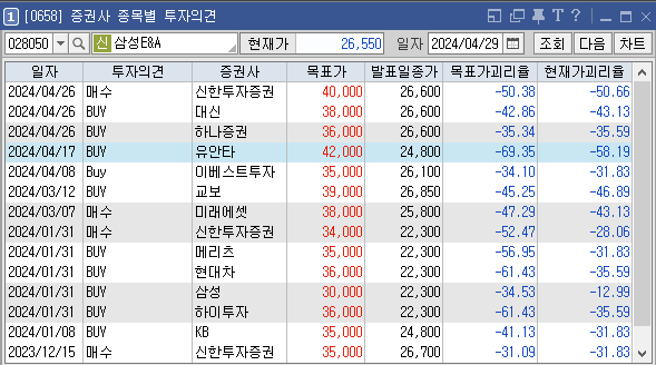 증권사별로 삼성E&A의 목표주가는 어떻게 추정하고 있는지와 투자의견은 어떠한지 살펴보겠습니다. 가장 최근에 증권사 신한투자증권에서 설정한 삼성E&A 목표가는 40000원이고 투자의견은 '매수'로 설정해놨습니다. 이전에 설정한 목표가 38000원, 36000원도 투자에 참고하시면 좋을것 같습니다