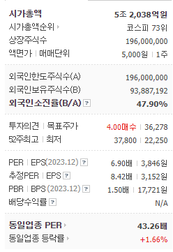 삼성E&A은 어떤 기업인지 먼저 정리해보고, 이어서 투자정보도 살펴보겠습니다. 삼성E&A의 시총은 5조 2,038억원이고, 시총 순위는 코스피 73위이며, 총 상장주식수는 196000000주 입니다. 그 밖에 PER, EPS는 각각 6.90배 l 3,846원이며, 동일 업종 PER이 43.26배인 것을 고려해서 현재 삼성E&A의 PER과 비교해보면 좋을것 같습니다. 현재 한 주당 배당금은 약 원 이며 그에따른 시가 배당률은 % 입니다. 그럼 이어서 삼성E&A의 재무실적 살펴보도록 하겠습니다.