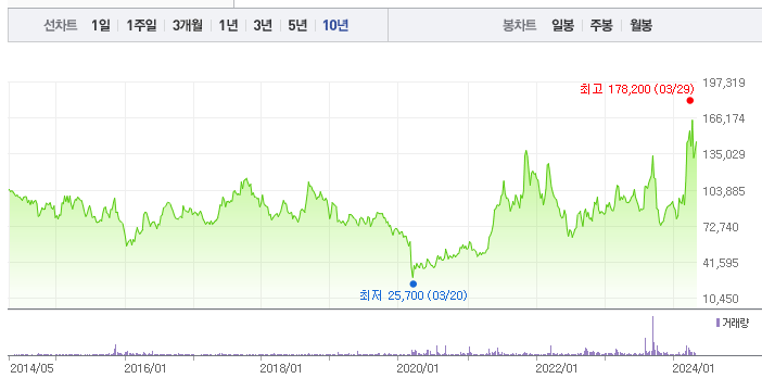 두산의 1년간 주가 흐름을 분석해보겠습니다. 두산 주가가 최고가를 기록했을때와 최저가를 기록했을때의 주가는 각각 178,200 l 72,100 이었습니다. 두산의 5년, 10년 차트를 보시면서 현재 두산의 흐름을 파악해보시는것도 투자에 큰 도움이 되실겁니다. 이어서 두산 목표주가에 대해 정리해보도록 하겠습니다.