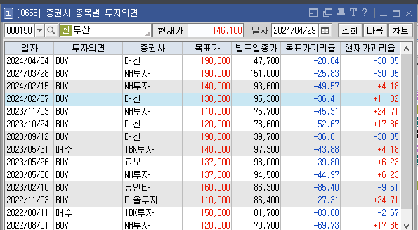 증권사별로 두산의 목표주가는 어떻게 추정하고 있는지와 투자의견은 어떠한지 살펴보겠습니다. 가장 최근에 증권사 대신에서 설정한 두산 목표가는 190000원이고 투자의견은 'BUY'로 설정해놨습니다. 이전에 설정한 목표가 190000원, 140000원도 투자에 참고하시면 좋을것 같습니다