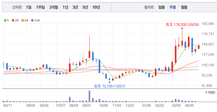 두산의 1년간 주가 흐름을 분석해보겠습니다. 두산 주가가 최고가를 기록했을때와 최저가를 기록했을때의 주가는 각각 178,200 l 72,100 이었습니다. 두산의 5년, 10년 차트를 보시면서 현재 두산의 흐름을 파악해보시는것도 투자에 큰 도움이 되실겁니다. 이어서 두산 목표주가에 대해 정리해보도록 하겠습니다.