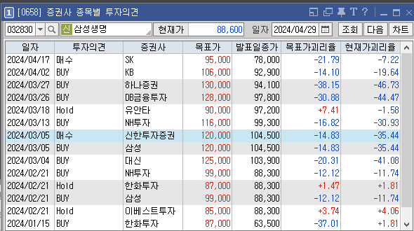 증권사별로 삼성생명의 목표주가는 어떻게 추정하고 있는지와 투자의견은 어떠한지 살펴보겠습니다. 가장 최근에 증권사 SK에서 설정한 삼성생명 목표가는 95000원이고 투자의견은 '매수'로 설정해놨습니다. 이전에 설정한 목표가 106000원, 130000원도 투자에 참고하시면 좋을것 같습니다