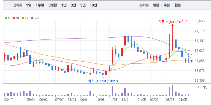 위메이드의 1년간 주가 흐름을 분석해보겠습니다. 위메이드 주가가 최고가를 기록했을때와 최저가를 기록했을때의 주가는 각각 80,500 l 33,050 이었습니다. 위메이드의 5년, 10년 차트를 보시면서 현재 위메이드의 흐름을 파악해보시는것도 투자에 큰 도움이 되실겁니다. 이어서 위메이드 목표주가에 대해 정리해보도록 하겠습니다.