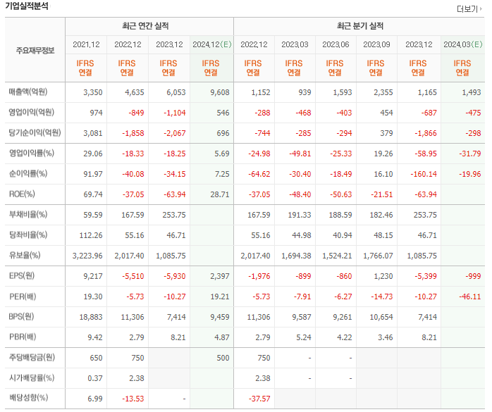 위메이드은 어떤 기업인지 먼저 정리해보고, 이어서 투자정보도 살펴보겠습니다. 위메이드의 시총은 1조 6,295억원이고, 시총 순위는 코스닥 29위이며, 총 상장주식수는 33948483주 입니다. 그 밖에 PER, EPS는 각각 N/A l -5,931원이며, 동일 업종 PER이 79.05배인 것을 고려해서 현재 위메이드의 PER과 비교해보면 좋을것 같습니다. 현재 한 주당 배당금은 약 원 이며 그에따른 시가 배당률은 % 입니다. 그럼 이어서 위메이드의 재무실적 살펴보도록 하겠습니다.