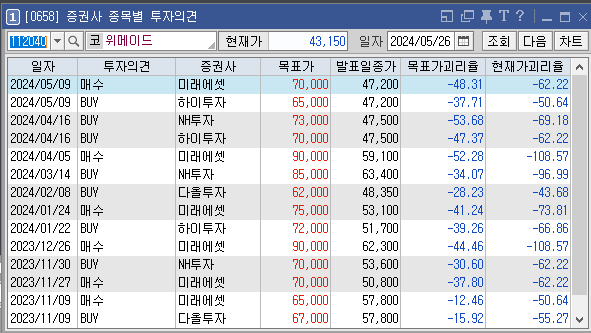 증권사별로 위메이드의 목표주가는 어떻게 추정하고 있는지와 투자의견은 어떠한지 살펴보겠습니다. 가장 최근에 증권사 NH투자에서 설정한 위메이드 목표가는 70000원이고 투자의견은 'BUY'로 설정해놨습니다. 이전에 설정한 목표가 65000원, 73000원도 투자에 참고하시면 좋을것 같습니다