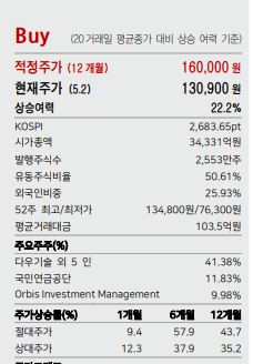 동사에 대한 투자의견은 Buy를 유지하며, 적정주가를 160,000원으로 상향 조정합니다. 이 가격은 12개월 후의 북자산가치가 196,849원이며, Target PBR을 0.8배로 적용한 결과입니다.