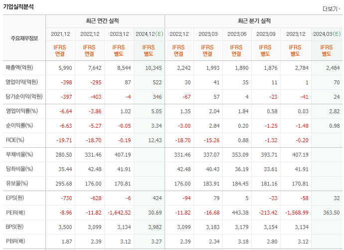 한화엔진의 재무를 살펴보면 전년도 매출액은 8544억원이고 영업이익 87억원, 당기순이익은 -4억원을 기록했었습니다. 전년도 부채비는 407.19% 정도 지고 있습니다. 이어서 한화엔진의 매분기 실적도 검토해 보겠습니다. 전분기 매출액은 2784억원이고 영업이익은 1억원이었습니다. 그에따른 당기순이익은 총 -41억원을 기록했고, 부채비는 407.19% 입니다.