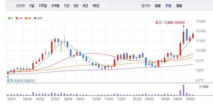 한화엔진의 1년간 주가 흐름을 분석해보겠습니다. 한화엔진 주가가 최고가를 기록했을때와 최저가를 기록했을때의 주가는 각각 13,890 l 7,560 이었습니다. 한화엔진의 5년, 10년 차트를 보시면서 현재 한화엔진의 흐름을 파악해보시는것도 투자에 큰 도움이 되실겁니다. 이어서 한화엔진 목표주가에 대해 정리해보도록 하겠습니다.