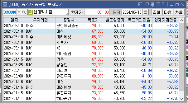 증권사별로 현대백화점의 목표주가는 어떻게 추정하고 있는지와 투자의견은 어떠한지 살펴보겠습니다. 가장 최근에 증권사 신한투자증권에서 설정한 현대백화점 목표가는 70000원이고 투자의견은 '매수'로 설정해놨습니다. 이전에 설정한 목표가 67000원, 65000원도 투자에 참고하시면 좋을것 같습니다