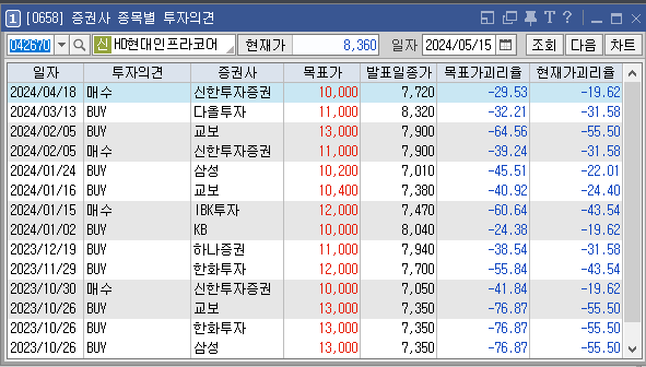 증권사별로 HD현대인프라코어의 목표주가는 어떻게 추정하고 있는지와 투자의견은 어떠한지 살펴보겠습니다. 가장 최근에 증권사 신한투자증권에서 설정한 HD현대인프라코어 목표가는 10000원이고 투자의견은 '매수'로 설정해놨습니다. 이전에 설정한 목표가 11000원, 13000원도 투자에 참고하시면 좋을것 같습니다
