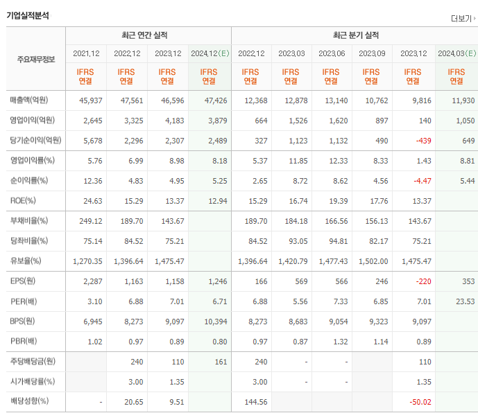 HD현대인프라코어은 어떤 기업인지 먼저 정리해보고, 이어서 투자정보도 살펴보겠습니다. HD현대인프라코어의 시총은 1조 6,687억원이고, 시총 순위는 코스피 172위이며, 총 상장주식수는 199603453주 입니다. 그 밖에 PER, EPS는 각각 7.22배 l 1,158원이며, 동일 업종 PER이 22.47배인 것을 고려해서 현재 HD현대인프라코어의 PER과 비교해보면 좋을것 같습니다. 현재 한 주당 배당금은 약 110원 이며 그에따른 시가 배당률은 1.35% 입니다. 그럼 이어서 HD현대인프라코어의 재무실적 살펴보도록 하겠습니다.