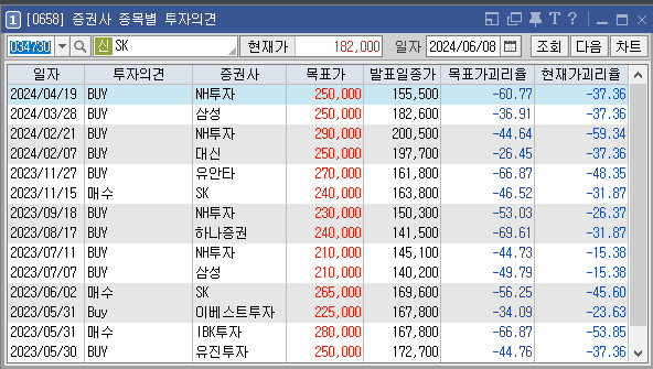 증권사별로 SK의 목표주가는 어떻게 추정하고 있는지와 투자의견은 어떠한지 살펴보겠습니다. 가장 최근에 증권사 NH투자에서 설정한 SK 목표가는 250000원이고 투자의견은 'BUY'로 설정해놨습니다. 이전에 설정한 목표가 250000원, 290000원도 투자에 참고하시면 좋을것 같습니다