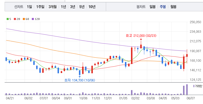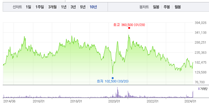 SK의 1년간 주가 흐름을 분석해보겠습니다. SK 주가가 최고가를 기록했을때와 최저가를 기록했을때의 주가는 각각 212,000 l 134,700 이었습니다. SK의 5년, 10년 차트를 보시면서 현재 SK의 흐름을 파악해보시는것도 투자에 큰 도움이 되실겁니다. 이어서 SK 목표주가에 대해 정리해보도록 하겠습니다.