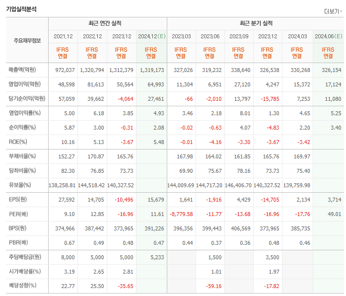 SK의 재무를 살펴보면 전년도 매출액은 1312379억원이고 영업이익 50564억원, 당기순이익은 -4064억원을 기록했었습니다. 전년도 부채비는 165.76% 정도 지고 있습니다. 이어서 SK의 매분기 실적도 검토해 보겠습니다. 전분기 매출액은 330268억원이고 영업이익은 15372억원이었습니다. 그에따른 당기순이익은 총 7253억원을 기록했고, 부채비는 169.97% 입니다.