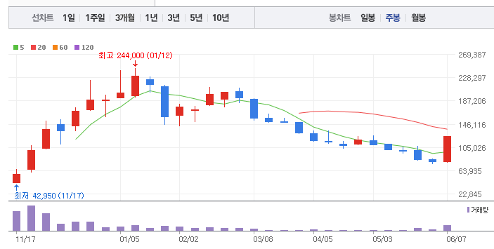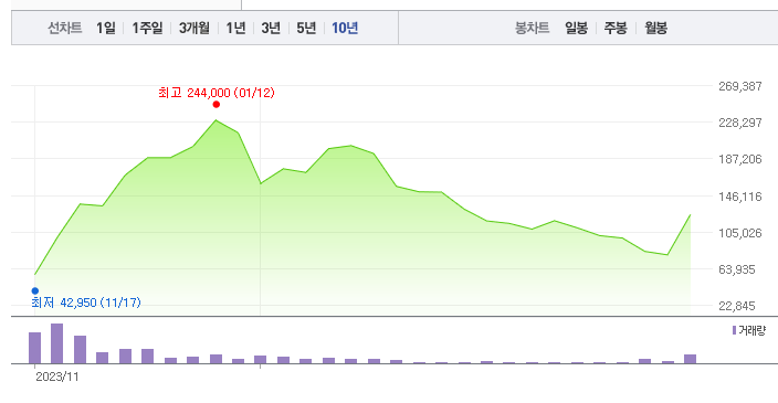 에코프로머티의 1년간 주가 흐름을 분석해보겠습니다. 에코프로머티 주가가 최고가를 기록했을때와 최저가를 기록했을때의 주가는 각각 244,000 l 42,950 이었습니다. 에코프로머티의 5년, 10년 차트를 보시면서 현재 에코프로머티의 흐름을 파악해보시는것도 투자에 큰 도움이 되실겁니다. 이어서 에코프로머티 목표주가에 대해 정리해보도록 하겠습니다.