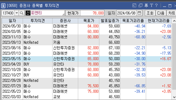 증권사별로 피엔티의 목표주가는 어떻게 추정하고 있는지와 투자의견은 어떠한지 살펴보겠습니다. 가장 최근에 증권사 미래에셋에서 설정한 피엔티 목표가는 84000원이고 투자의견은 '매수'로 설정해놨습니다. 이전에 설정한 목표가 60000원, 80000원도 투자에 참고하시면 좋을것 같습니다