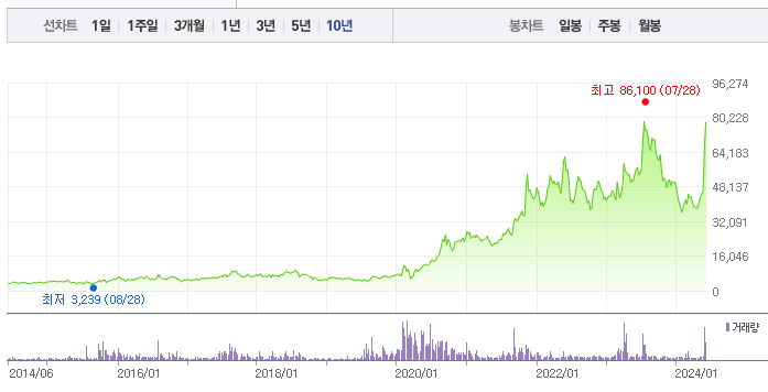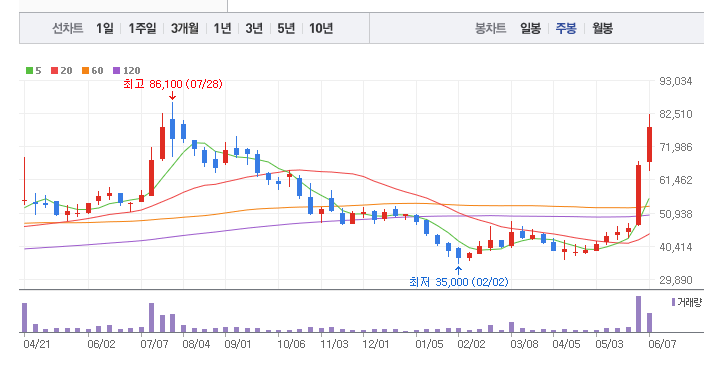 피엔티의 1년간 주가 흐름을 분석해보겠습니다. 피엔티 주가가 최고가를 기록했을때와 최저가를 기록했을때의 주가는 각각 86,100 l 35,000 이었습니다. 피엔티의 5년, 10년 차트를 보시면서 현재 피엔티의 흐름을 파악해보시는것도 투자에 큰 도움이 되실겁니다. 이어서 피엔티 목표주가에 대해 정리해보도록 하겠습니다.