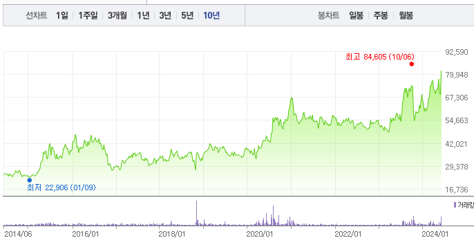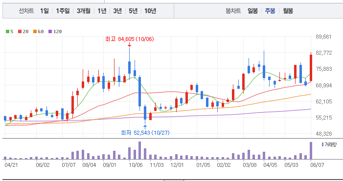 유한양행의 1년간 주가 흐름을 분석해보겠습니다. 유한양행 주가가 최고가를 기록했을때와 최저가를 기록했을때의 주가는 각각 84,605 l 52,543 이었습니다. 유한양행의 5년, 10년 차트를 보시면서 현재 유한양행의 흐름을 파악해보시는것도 투자에 큰 도움이 되실겁니다. 이어서 유한양행 목표주가에 대해 정리해보도록 하겠습니다.