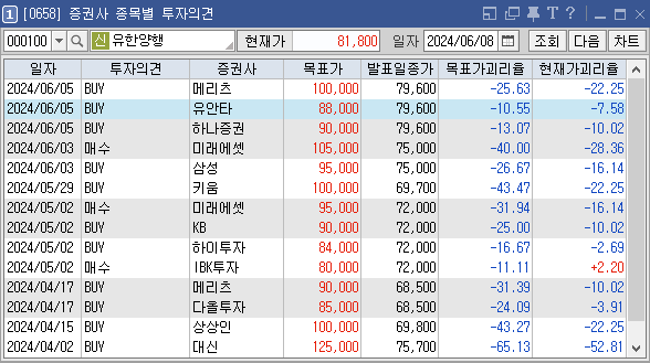 증권사별로 유한양행의 목표주가는 어떻게 추정하고 있는지와 투자의견은 어떠한지 살펴보겠습니다. 가장 최근에 증권사 메리츠에서 설정한 유한양행 목표가는 100000원이고 투자의견은 'BUY'로 설정해놨습니다. 이전에 설정한 목표가 88000원, 90000원도 투자에 참고하시면 좋을것 같습니다