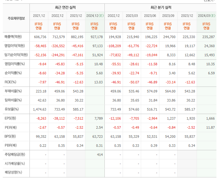 한국전력의 재무를 살펴보면 전년도 매출액은 882195억원이고 영업이익 -45416억원, 당기순이익은 -47161억원을 기록했었습니다. 전년도 부채비는 543.28% 정도 지고 있습니다. 이어서 한국전력의 매분기 실적도 검토해 보겠습니다. 전분기 매출액은 225330억원이고 영업이익은 19117억원이었습니다. 그에따른 당기순이익은 총 12662억원을 기록했고, 부채비는 543.28% 입니다.