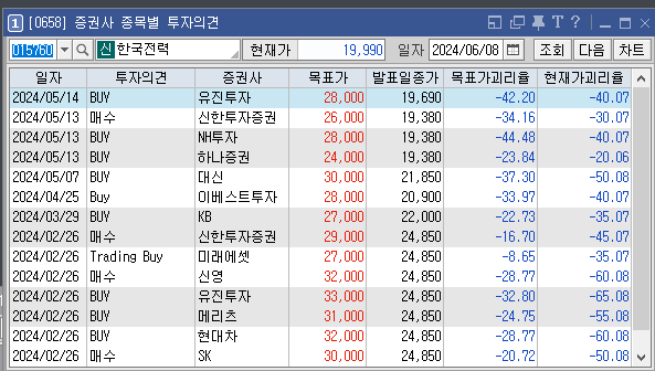 증권사별로 한국전력의 목표주가는 어떻게 추정하고 있는지와 투자의견은 어떠한지 살펴보겠습니다. 가장 최근에 증권사 KB에서 설정한 한국전력 목표가는 27000원이고 투자의견은 'BUY'로 설정해놨습니다. 이전에 설정한 목표가 29000원, 27000원도 투자에 참고하시면 좋을것 같습니다