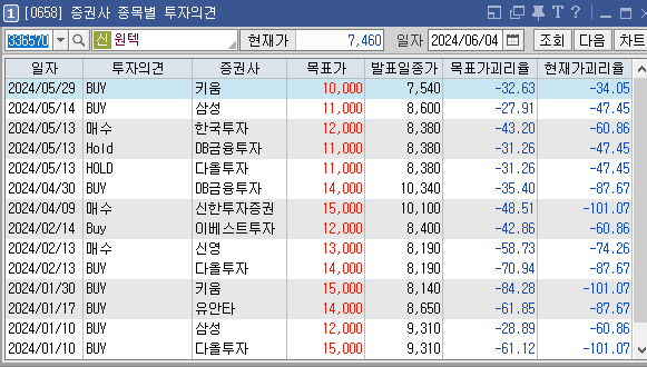 증권사별로 원텍의 목표주가는 어떻게 추정하고 있는지와 투자의견은 어떠한지 살펴보겠습니다. 가장 최근에 증권사 신한투자증권에서 설정한 원텍 목표가는 15000원이고 투자의견은 '매수'로 설정해놨습니다. 이전에 설정한 목표가 12000원, 13000원도 투자에 참고하시면 좋을것 같습니다