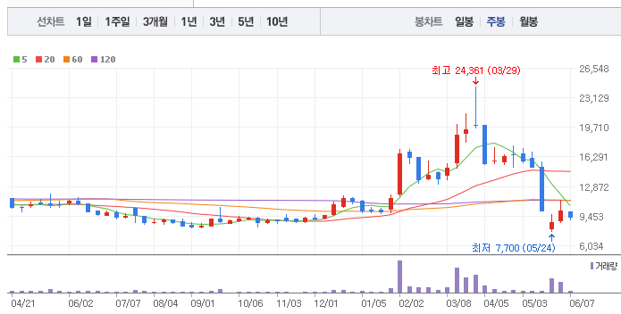 - 최근 고점: 최근 2만원의 고점을 돌파하지 못하고 조정 상태에 있습니다.