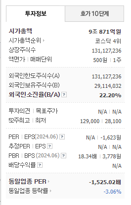 HLB은 어떤 기업인지 먼저 정리해보고, 이어서 투자정보도 살펴보겠습니다. HLB의 시총은 9조 871억원이고, 시총 순위는 코스닥 4위이며, 총 상장주식수는 131127236주 입니다. 그 밖에 PER, EPS는 각각 N/A l -1,623원이며, 동일 업종 PER이 -1,525.02배인 것을 고려해서 현재 HLB의 PER과 비교해보면 좋을것 같습니다. 현재 한 주당 배당금은 약 원 이며 그에따른 시가 배당률은 % 입니다. 그럼 이어서 HLB의 재무실적 살펴보도록 하겠습니다.