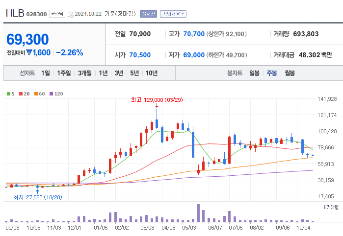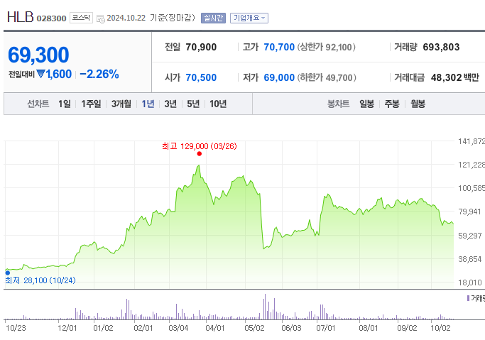 HLB의 1년간 주가 흐름을 분석해보겠습니다. HLB 주가가 최고가를 기록했을때와 최저가를 기록했을때의 주가는 각각 129,000 l 28,100 이었습니다. HLB의 5년, 10년 차트를 보시면서 현재 HLB의 흐름을 파악해보시는것도 투자에 큰 도움이 되실겁니다. 이어서 HLB 목표주가에 대해 정리해보도록 하겠습니다.