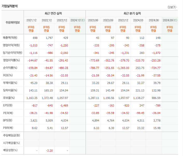 HLB의 재무를 살펴보면 전년도 매출액은 429억원이고 영업이익 -1250억원, 당기순이익은 -2060억원을 기록했었습니다. 전년도 부채비는 29.11% 정도 지고 있습니다. 이어서 HLB의 매분기 실적도 검토해 보겠습니다. 전분기 매출액은 148억원이고 영업이익은 -375억원이었습니다. 그에따른 당기순이익은 총 -1072억원을 기록했고, 부채비는 39.79% 입니다.