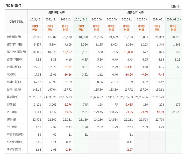 카카오은 어떤 기업인지 먼저 정리해보고, 이어서 투자정보도 살펴보겠습니다. 카카오의 시총은 16조 5,659억원이고, 시총 순위는 코스피 25위이며, 총 상장주식수는 443530908주 입니다. 그 밖에 PER, EPS는 각각 N/A l -2,187원이며, 동일 업종 PER이 86.65배인 것을 고려해서 현재 카카오의 PER과 비교해보면 좋을것 같습니다. 현재 한 주당 배당금은 약 61원 이며 그에따른 시가 배당률은 0.11% 입니다. 그럼 이어서 카카오의 재무실적 살펴보도록 하겠습니다.