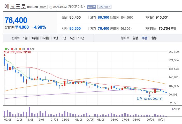 에코프로의 1년간 주가 흐름을 분석해보겠습니다. 에코프로 주가가 최고가를 기록했을때와 최저가를 기록했을때의 주가는 각각 185,600 l 72,600 이었습니다. 에코프로의 5년, 10년 차트를 보시면서 현재 에코프로의 흐름을 파악해보시는것도 투자에 큰 도움이 되실겁니다. 이어서 에코프로 목표주가에 대해 정리해보도록 하겠습니다.