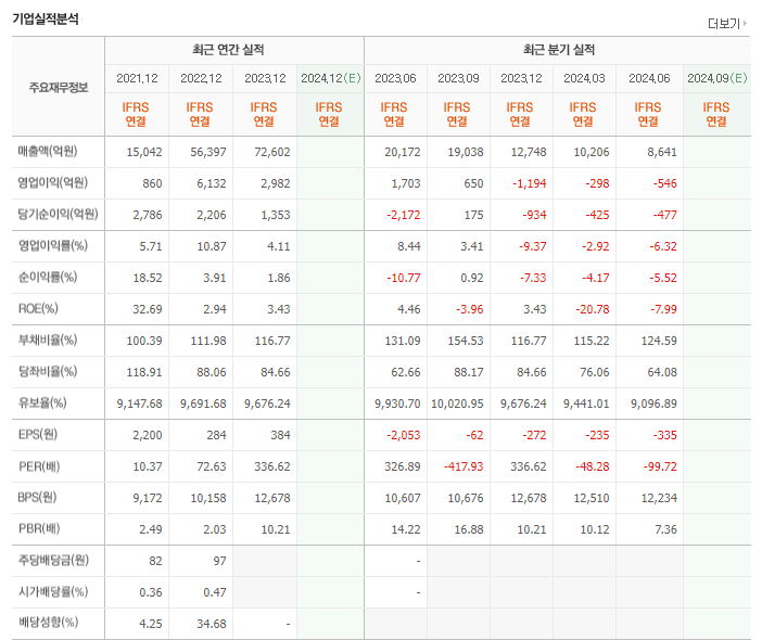 에코프로의 재무를 살펴보면 전년도 매출액은 72602억원이고 영업이익 2982억원, 당기순이익은 1353억원을 기록했었습니다. 전년도 부채비는 116.77% 정도 지고 있습니다. 이어서 에코프로의 매분기 실적도 검토해 보겠습니다. 전분기 매출액은 8641억원이고 영업이익은 -546억원이었습니다. 그에따른 당기순이익은 총 -477억원을 기록했고, 부채비는 124.59% 입니다.