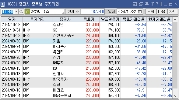 증권사별로 SK하이닉스의 목표주가는 어떻게 추정하고 있는지와 투자의견은 어떠한지 살펴보겠습니다. 가장 최근에 증권사 상상인에서 설정한 SK하이닉스 목표가는 300000원이고 투자의견은 'BUY'로 설정해놨습니다. 이전에 설정한 목표가 300000원, 290000원도 투자에 참고하시면 좋을것 같습니다