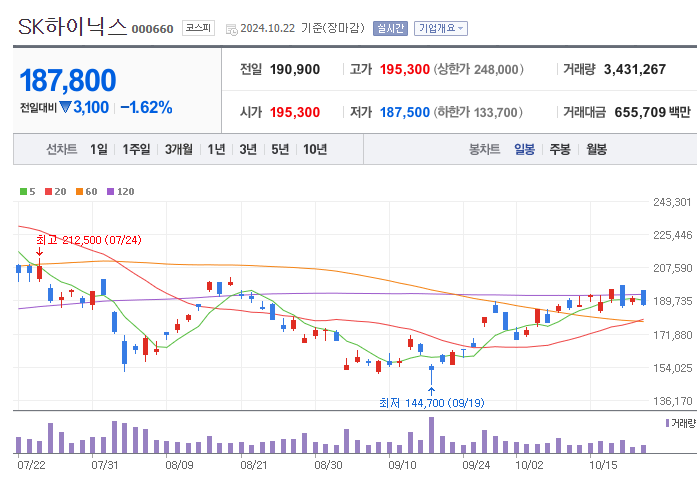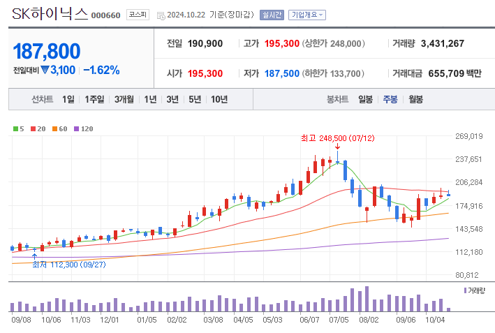 SK하이닉스의 1년간 주가 흐름을 분석해보겠습니다. SK하이닉스 주가가 최고가를 기록했을때와 최저가를 기록했을때의 주가는 각각 248,500 l 116,300 이었습니다. SK하이닉스의 5년, 10년 차트를 보시면서 현재 SK하이닉스의 흐름을 파악해보시는것도 투자에 큰 도움이 되실겁니다. 이어서 SK하이닉스 목표주가에 대해 정리해보도록 하겠습니다.