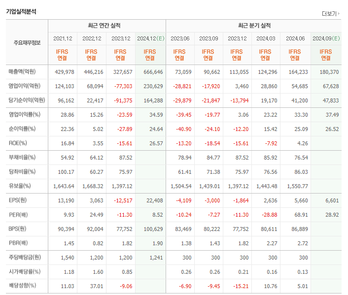 SK하이닉스은 어떤 기업인지 먼저 정리해보고, 이어서 투자정보도 살펴보겠습니다. SK하이닉스의 시총은 136조 7,188억원이고, 시총 순위는 코스피 2위이며, 총 상장주식수는 728002365주 입니다. 그 밖에 PER, EPS는 각각 54.72배 l 3,432원이며, 동일 업종 PER이 17.32배인 것을 고려해서 현재 SK하이닉스의 PER과 비교해보면 좋을것 같습니다. 현재 한 주당 배당금은 약 1200원 이며 그에따른 시가 배당률은 0.85% 입니다. 그럼 이어서 SK하이닉스의 재무실적 살펴보도록 하겠습니다.