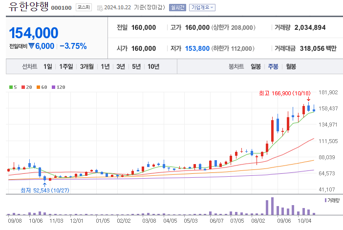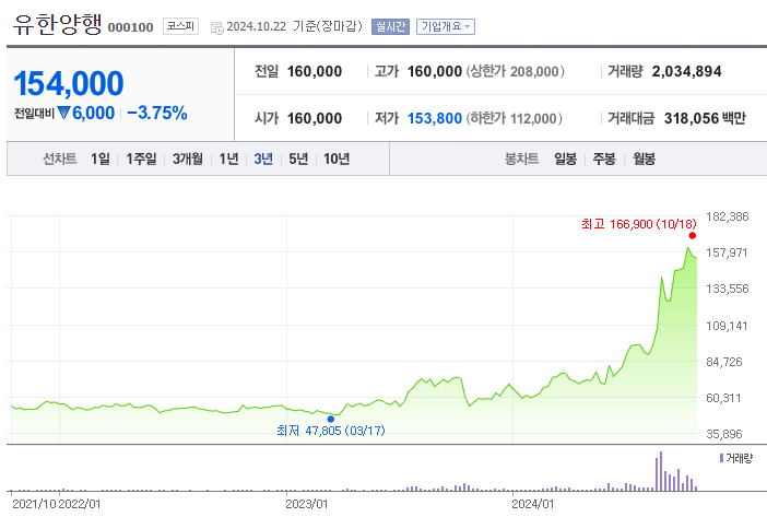 유한양행의 1년간 주가 흐름을 분석해보겠습니다. 유한양행 주가가 최고가를 기록했을때와 최저가를 기록했을때의 주가는 각각 166,900 l 52,543 이었습니다. 유한양행의 5년, 10년 차트를 보시면서 현재 유한양행의 흐름을 파악해보시는것도 투자에 큰 도움이 되실겁니다. 이어서 유한양행 목표주가에 대해 정리해보도록 하겠습니다.