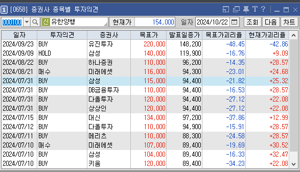 증권사별로 유한양행의 목표주가는 어떻게 추정하고 있는지와 투자의견은 어떠한지 살펴보겠습니다. 가장 최근에 증권사 유진투자에서 설정한 유한양행 목표가는 220000원이고 투자의견은 'BUY'로 설정해놨습니다. 이전에 설정한 목표가 140000원, 110000원도 투자에 참고하시면 좋을것 같습니다
