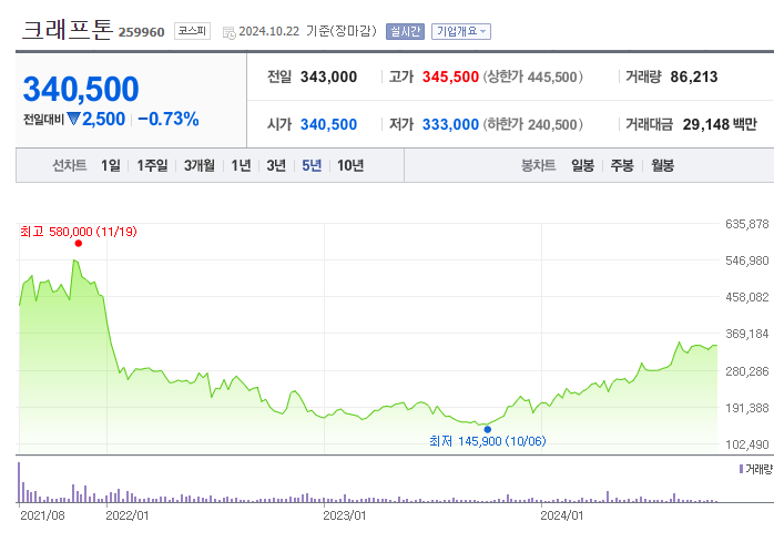 크래프톤의 1년간 주가 흐름을 분석해보겠습니다. 크래프톤 주가가 최고가를 기록했을때와 최저가를 기록했을때의 주가는 각각 355,000 l 155,700 이었습니다. 크래프톤의 5년, 10년 차트를 보시면서 현재 크래프톤의 흐름을 파악해보시는것도 투자에 큰 도움이 되실겁니다. 이어서 크래프톤 목표주가에 대해 정리해보도록 하겠습니다.