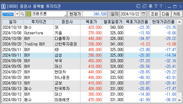 증권사별로 크래프톤의 목표주가는 어떻게 추정하고 있는지와 투자의견은 어떠한지 살펴보겠습니다. 가장 최근에 증권사 SK에서 설정한 크래프톤 목표가는 420000원이고 투자의견은 '매수'로 설정해놨습니다. 이전에 설정한 목표가 370000원, 440000원도 투자에 참고하시면 좋을것 같습니다.