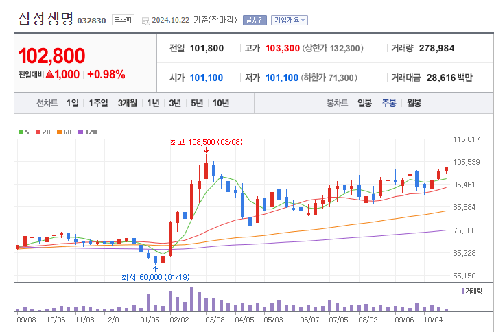 삼성생명의 1년간 주가 흐름을 분석해보겠습니다. 삼성생명 주가가 최고가를 기록했을때와 최저가를 기록했을때의 주가는 각각 108,500 l 60,000 이었습니다. 삼성생명의 5년, 10년 차트를 보시면서 현재 삼성생명의 흐름을 파악해보시는것도 투자에 큰 도움이 되실겁니다. 이어서 삼성생명 목표주가에 대해 정리해보도록 하겠습니다.