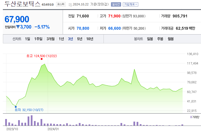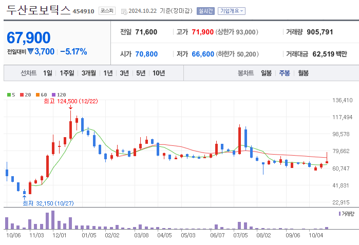 두산로보틱스의 1년간 주가 흐름을 분석해보겠습니다. 두산로보틱스 주가가 최고가를 기록했을때와 최저가를 기록했을때의 주가는 각각 108,500 l 60,000 이었습니다. 두산로보틱스의 5년, 10년 차트를 보시면서 현재 두산로보틱스의 흐름을 파악해보시는것도 투자에 큰 도움이 되실겁니다. 이어서 두산로보틱스 목표주가에 대해 정리해보도록 하겠습니다.