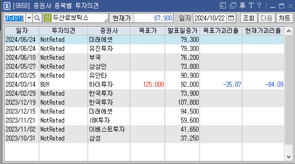 증권사별로 두산로보틱스의 목표주가는 어떻게 추정하고 있는지와 투자의견은 어떠한지 살펴보겠습니다. 가장 최근에 증권사 하이투자에서 설정한 두산로보틱스 목표가는 125000원이고 투자의견은 '매수'로 설정해놨습니다.