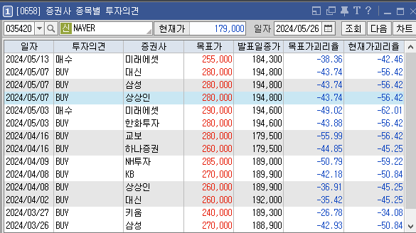 증권사별로 네이버의 목표주가는 어떻게 추정하고 있는지와 투자의견은 어떠한지 살펴보겠습니다. 가장 최근에 증권사 교보에서 설정한 네이버 목표가는 255000원이고 투자의견은 'BUY'로 설정해놨습니다. 이전에 설정한 목표가 280000원, 280000원도 투자에 참고하시면 좋을것 같습니다