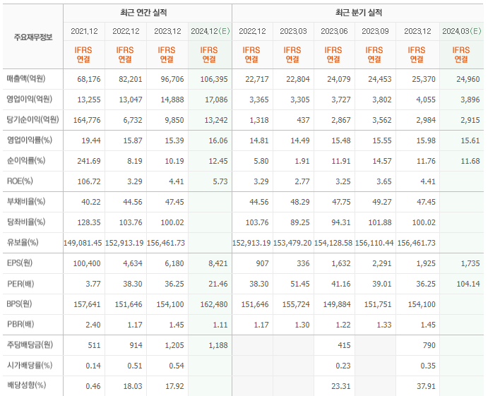 1분기 2024년의 검토 결과, 매출액은 2.5 조원으로 전년 대비 10.8% 증가했습니다. 영업이익은 4,393 억원으로 전년 대비 32.9% 증가하여, 영업이익률은 17.4%로 전년 대비 2.9%포인트 상승했습니다. 지배주주순이익도 5,106 억원으로 전년 대비 827.4% 상승했습니다. 이번 분기에는 비용 통제 효과가 두드러졌는데, 서치플랫폼 회복, 콘텐츠 손실 축소, 네이버제트 연결 제외, 주식보상비용 감소 등이 그 주요 이유였습니다.