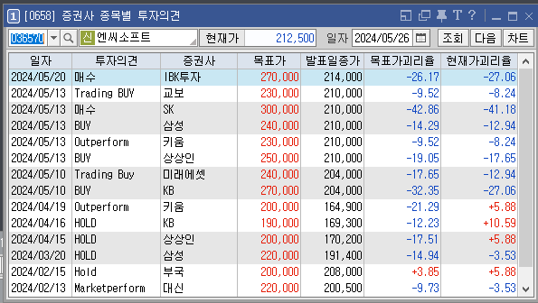 증권사별로 엔씨소프트의 목표주가는 어떻게 추정하고 있는지와 투자의견은 어떠한지 살펴보겠습니다. 가장 최근에 증권사 키움에서 설정한 엔씨소프트 목표가는 270000원이고 투자의견은 'Outperform'로 설정해놨습니다. 이전에 설정한 목표가 230000원, 300000원도 투자에 참고하시면 좋을것 같습니다
