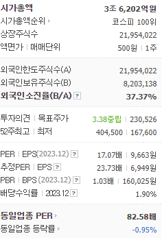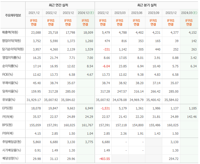 엔씨소프트은 어떤 기업인지 먼저 정리해보고, 이어서 투자정보도 살펴보겠습니다. 엔씨소프트의 시총은 3조 6,202억원이고, 시총 순위는 코스피 100위이며, 총 상장주식수는 21954022주 입니다. 그 밖에 PER, EPS는 각각 17.07배 l 9,663원이며, 동일 업종 PER이 82.58배인 것을 고려해서 현재 엔씨소프트의 PER과 비교해보면 좋을것 같습니다. 현재 한 주당 배당금은 약 3130원 이며 그에따른 시가 배당률은 1.3% 입니다. 그럼 이어서 엔씨소프트의 재무실적 살펴보도록 하겠습니다.