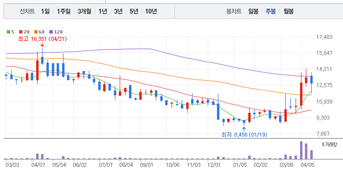 대한전선의 1년간 주가 흐름을 분석해보겠습니다. 대한전선 주가가 최고가를 기록했을때와 최저가를 기록했을때의 주가는 각각 15,788 l 8,456 이었습니다. 대한전선의 5년, 10년 차트를 보시면서 현재 대한전선의 흐름을 파악해보시는것도 투자에 큰 도움이 되실겁니다. 이어서 대한전선 목표주가에 대해 정리해보도록 하겠습니다.