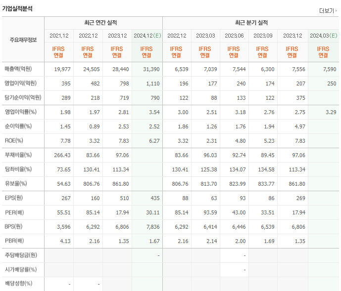 대한전선의 과거 실적과 주가 움직임을 분석하면, 실적이 늘어남에도 불구하고 주가는 하락세를 보였다는 점이 아이러니합니다. 이는 특정 시점을 기준으로 대한전선의 적정 주가가 다르게 평가될 수 있음을 의미합니다. 2024년 1분기의 영업이익률 3.6%는 2020년의 3.55%와 비슷합니다.