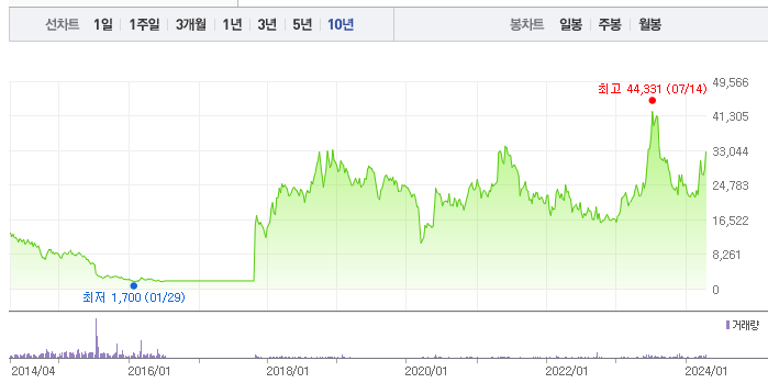한화오션의 1년간 주가 흐름을 분석해보겠습니다. 한화오션 주가가 최고가를 기록했을때와 최저가를 기록했을때의 주가는 각각 44,331 l 21,050 이었습니다. 한화오션의 5년, 10년 차트를 보시면서 현재 한화오션의 흐름을 파악해보시는것도 투자에 큰 도움이 되실겁니다. 이어서 한화오션 목표주가에 대해 정리해보도록 하겠습니다.